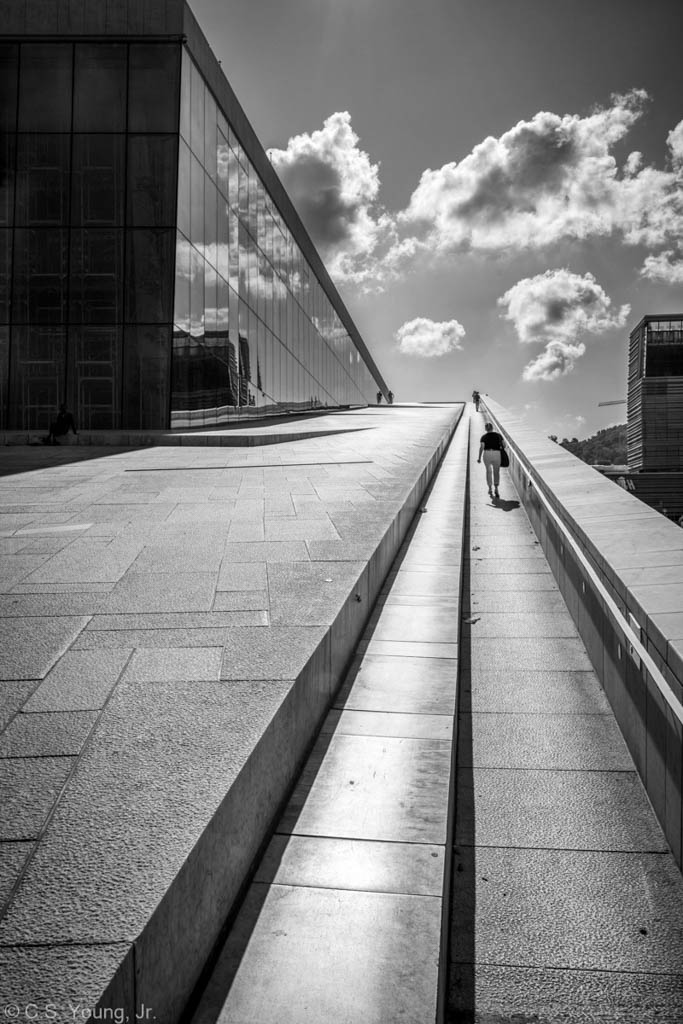 The building resembles a glacier flowing into the Oslofjord inlet. The white granite structure invites pedestrians to walk up and enjoy a panoramic view of Oslo from the roof. The strong lines and angular shape were an architectural photographer’s dream.