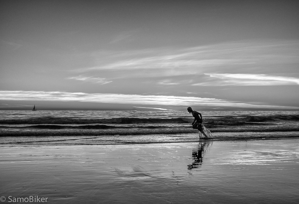 A boy runs in the surf during the golden hour at the beach in Santa Monica. While the rest of the country is busy shoveling snow and trying to keep warm, those of us in SoCal are suffering through a drought and unseasonably warm weather. And by suffering I mean enjoying playing in the surf in late November.