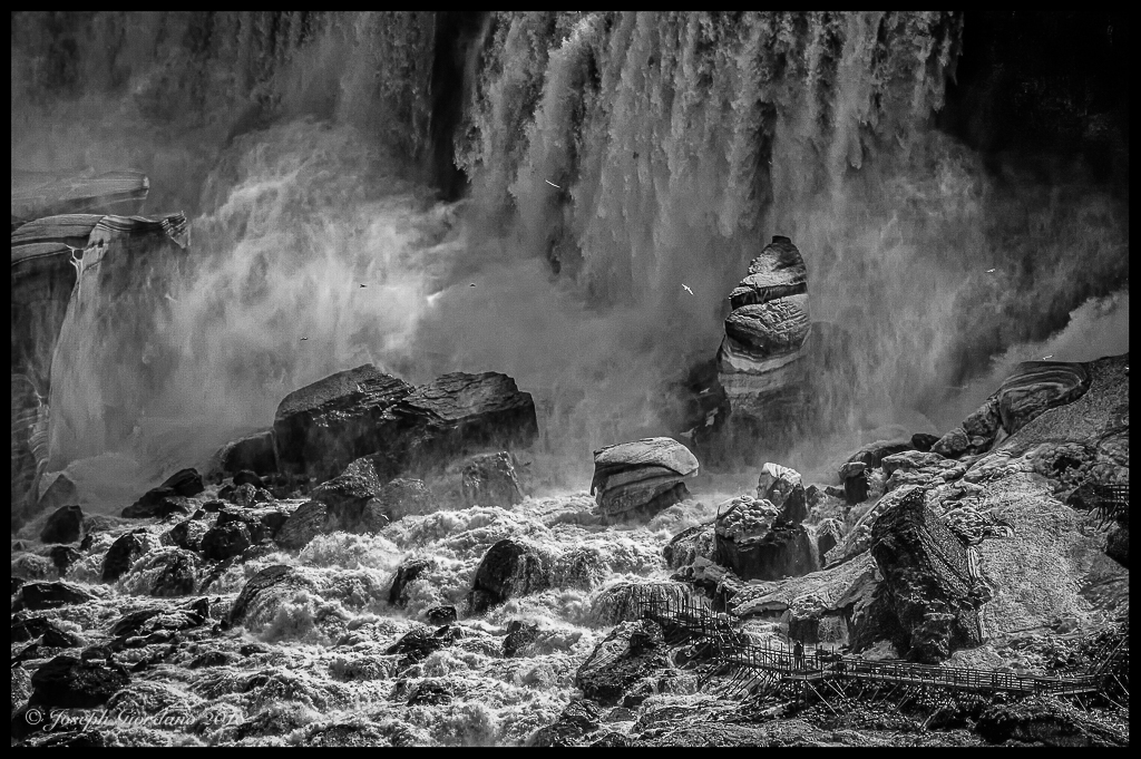 I took this photo in April of 2007 when I was still using Nikon brand cameras. You can still see some of the ice formations and the workmen rebuilding the Cave Of The Winds decking (as they must do every year). I used a Nikon D70s camera and a 70–300 lens. Taken from the Canadian side of the Niagara River.