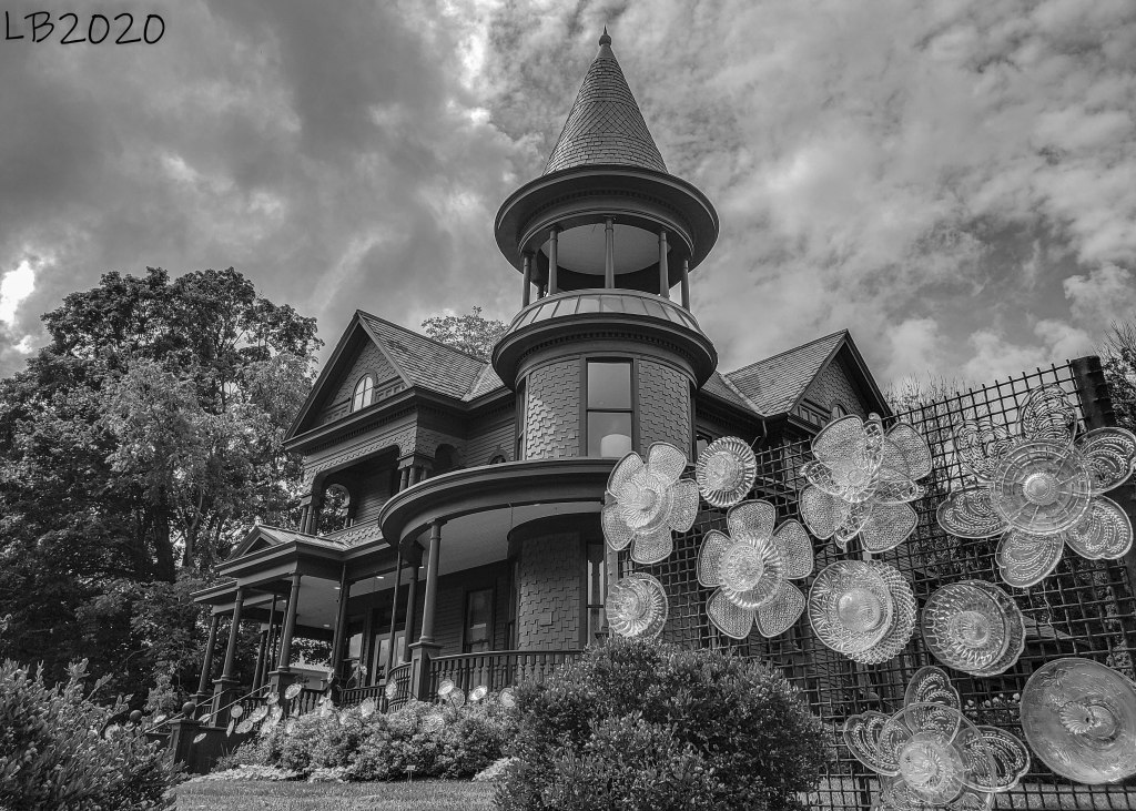 Black And White Photography, Laurie, PhotographyBuilt in 1897, the Alexander Black House is now home to the Blacksburg Museum and Cultural Foundation. While temporarily closed due to CoVid19, the museum is hosting an outdoor exhibit called Glass Flower Gates by artist Diane Relf. “Heavy metal grids support glass flowers made from punch bowls, vintage snack sets, and other glassware to create a welcoming and whimsical experience for guests as they approach the Alexander Black House & Cultural Center”.