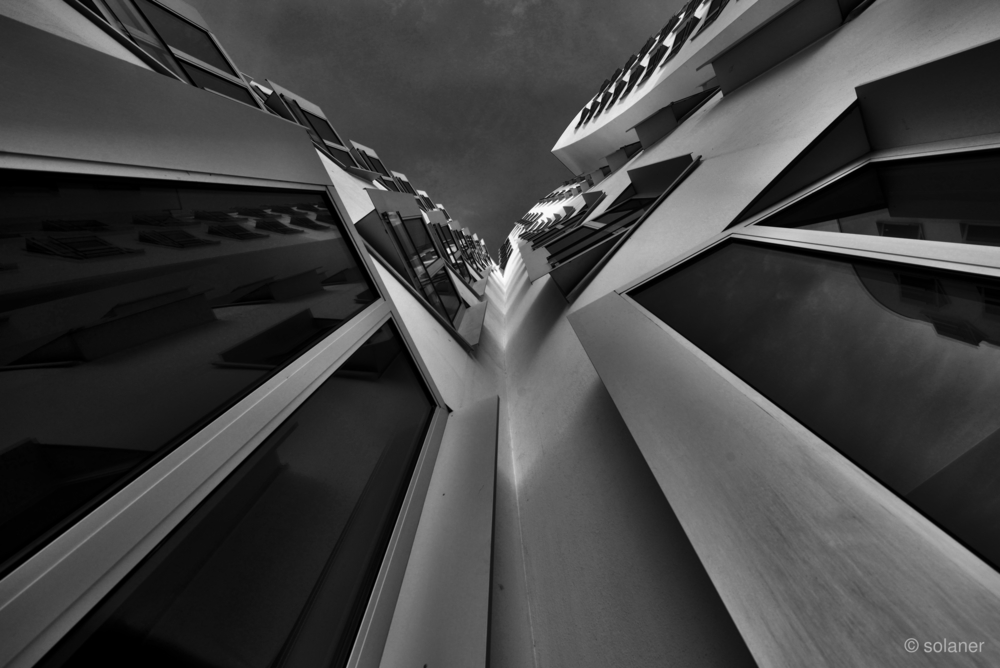 A detail of the “Tanzende Häuser” (dancing buildings) built by the US architect Frank Gehry.