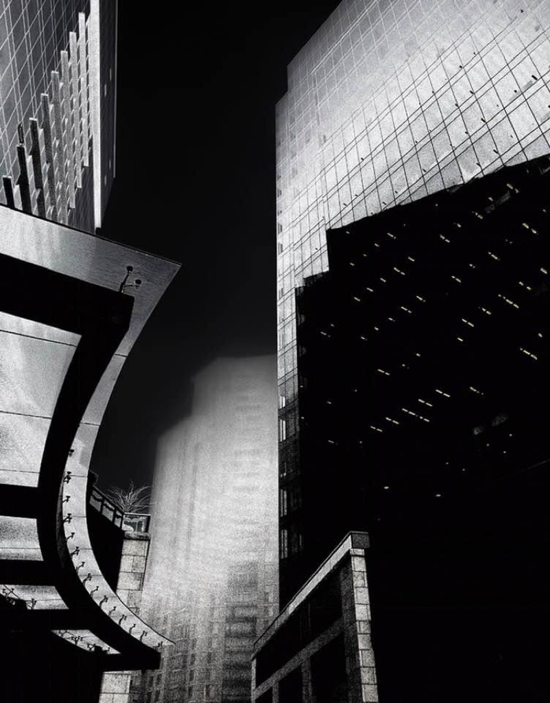 I was having difficulty sleeping so my husband and I went out for a shoot. Well, he drove and I hopped out along the way to take shots. There was a lot of mist in the air which made shapes much more dramatic against the black sky. I took this at 4am in the Harbor East area of Baltimore.