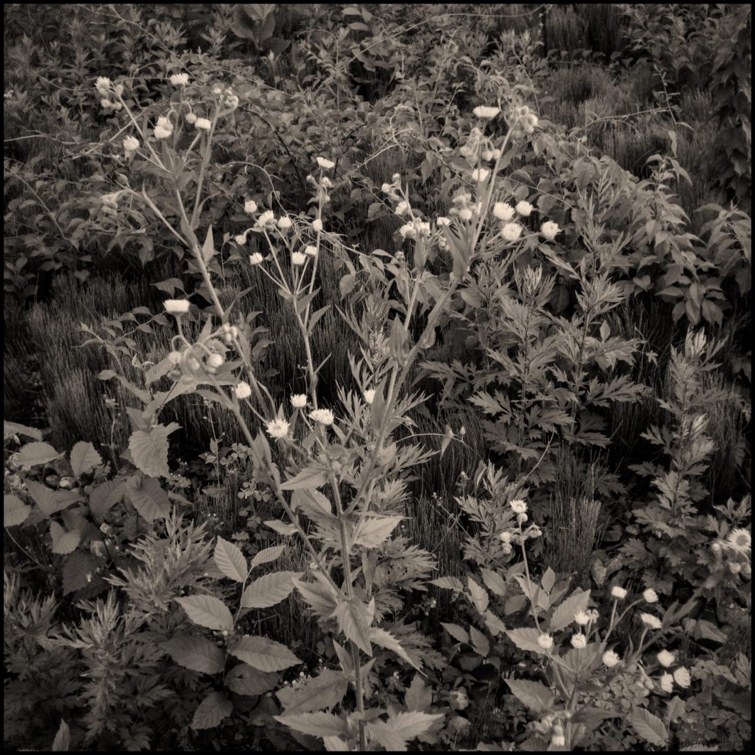 Olympus OMD EM5 with 15mm body cap lens. I processed the in camera black and white jpeg in PS EXpress and Snapseed. Can you tell I paid less than $20 for the lens? The gardeners among you will no doubt recognize that everything growing in my little patch is a weed, but aren’t they lovely?