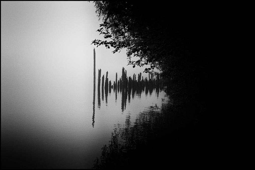 Every now and again I see a black and white photo that looks like it could have been drawn by some artist. Just simple lines on paper. When I got home and saw this shot on a large display I got the that feeling that it had been drawn by my camera. The magic ends when I tell you that it is the remains of an old dock in the local river taken early one foggy morning. So just imagine I painted it instead.
