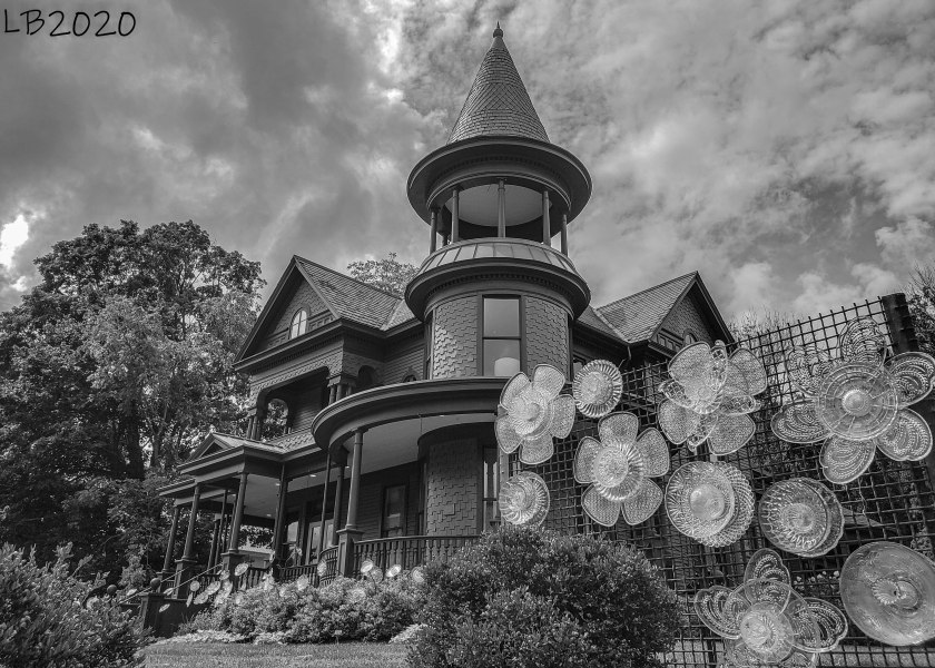 Built in 1897, the Alexander Black House is now home to the Blacksburg Museum and Cultural Foundation. While temporarily closed due to CoVid19, the museum is hosting an outdoor exhibit called Glass Flower Gates by artist Diane Relf. “Heavy metal grids support glass flowers made from punch bowls, vintage snack sets, and other glassware to create a welcoming and whimsical experience for guests as they approach the Alexander Black House & Cultural Center”.