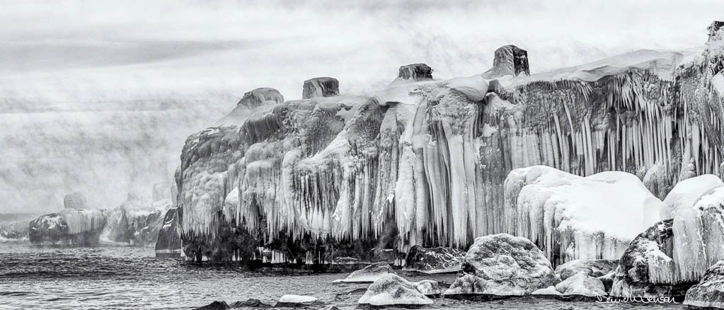 Just looking at this image gives me chills. An icy cliff face at Gooseberry Falls State Park on a typical northern Minnesota winter day. Temps in the mid-teens, wind gusts around 30mph, waves crashing on the rocks and snow blowing off the cliff.