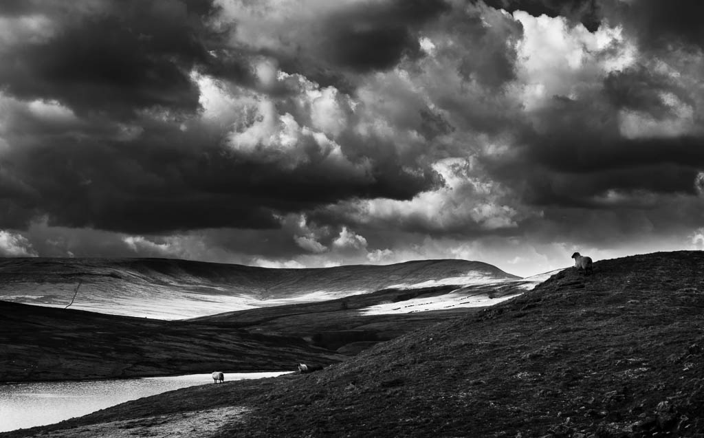 This Swaledale sheep must be enjoying the spectacular views over Scar House reservoir and Great Whernside mountain. Nidderdale. North Yorkshire