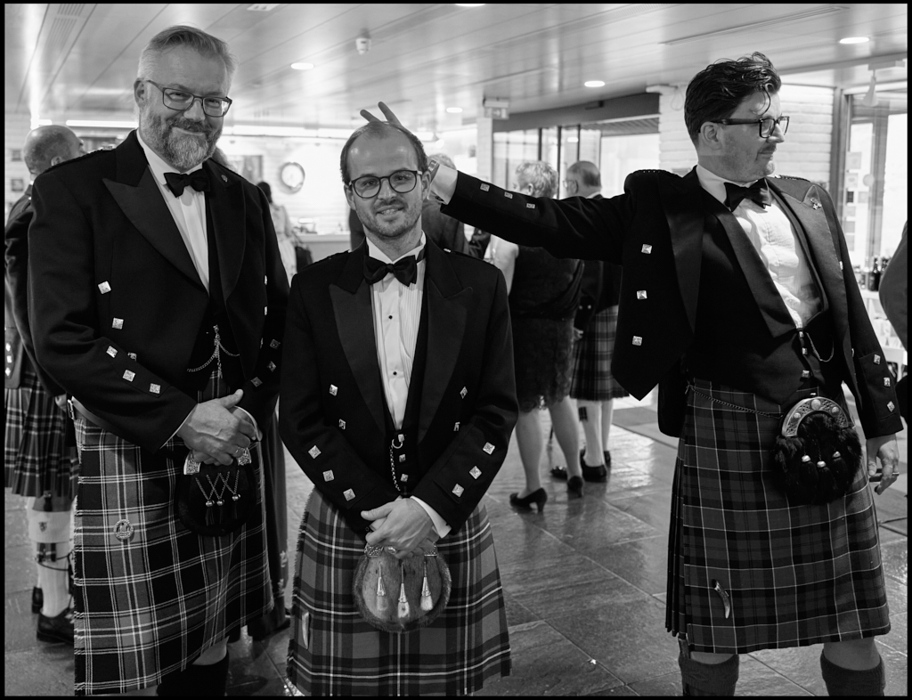 Yes, sometimes they can ruin a picture. But, I know these three very well and they are always great company. We were attending a formal occasion (the British ambassador was in attendance )to celebrate the Caledonian Society of Norways 75th anniversary. I say formal however there was also a great deal of fun as can be seen here. A great night was had by all.