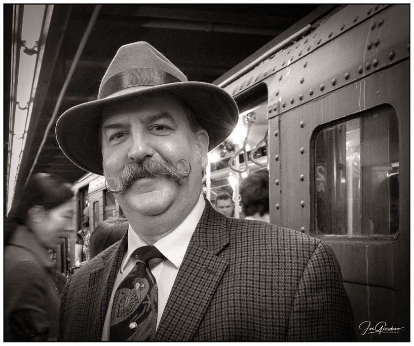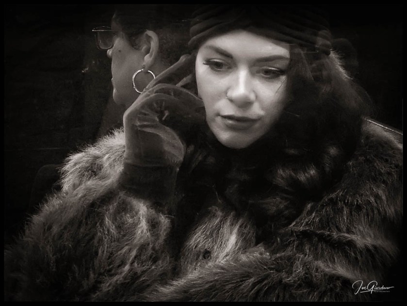 A beautiful young woman dressed in vintage clothing strikes a pose before taking a ride on the NYC Holiday Nostalgia Train. Image was taken with a Fujifilm X30 compact camera.