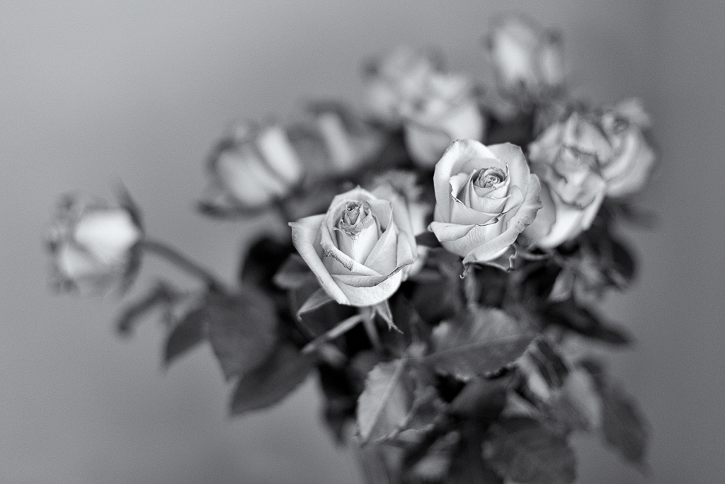 From Dandelions last week to roses this week. A red roses can also look good in black and white. I took this on a Canon G9 on a pocket tripod, in light from a window the vase was standing beside. “The best camera is the one you have with you.” rings true